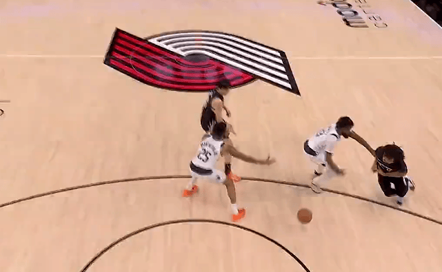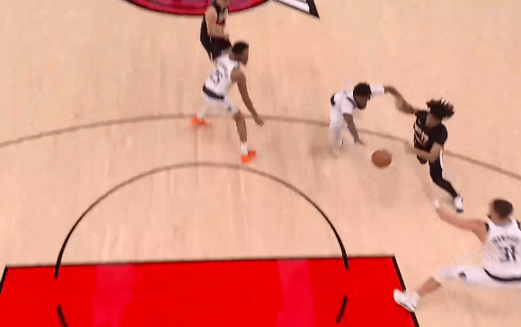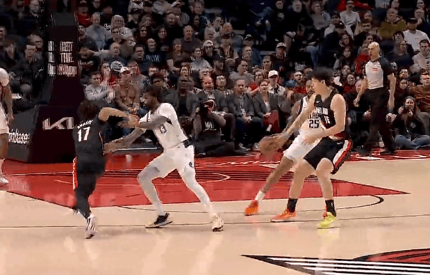 第一节比赛中,杨瀚森弧顶挡拆送出击地妙传,夏普接球起飞抛投打进。