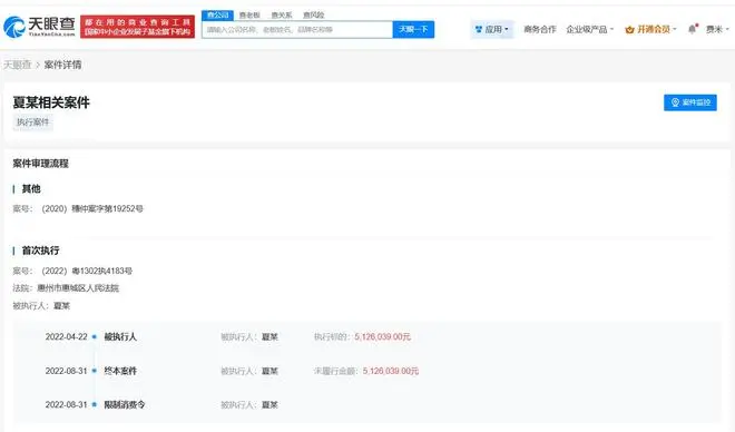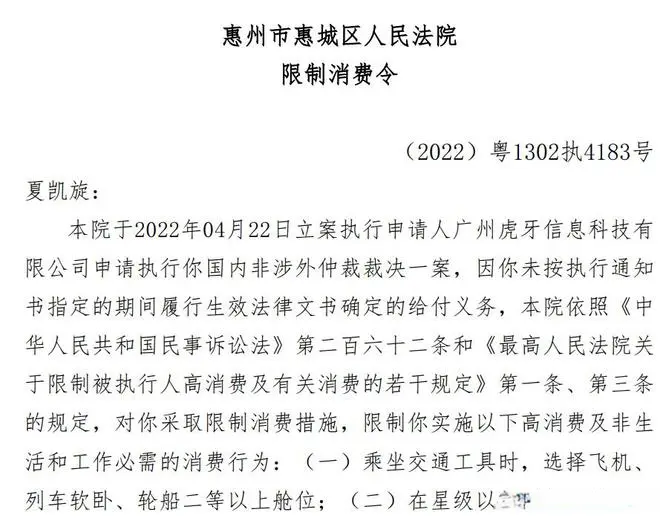 天眼查法律诉讼信息显示,夏凯旋(网红“狗头萝莉”本名)现存一则终本案件信息,未履行金额512万余元,案件流程信息显示,2022年4月,夏凯旋因该案被执行512万余元,2022年8月,夏凯旋因该案件被限制高消费,申请人为广州虎牙信息科技有限公司,涉及国内非涉外仲裁裁决案件。